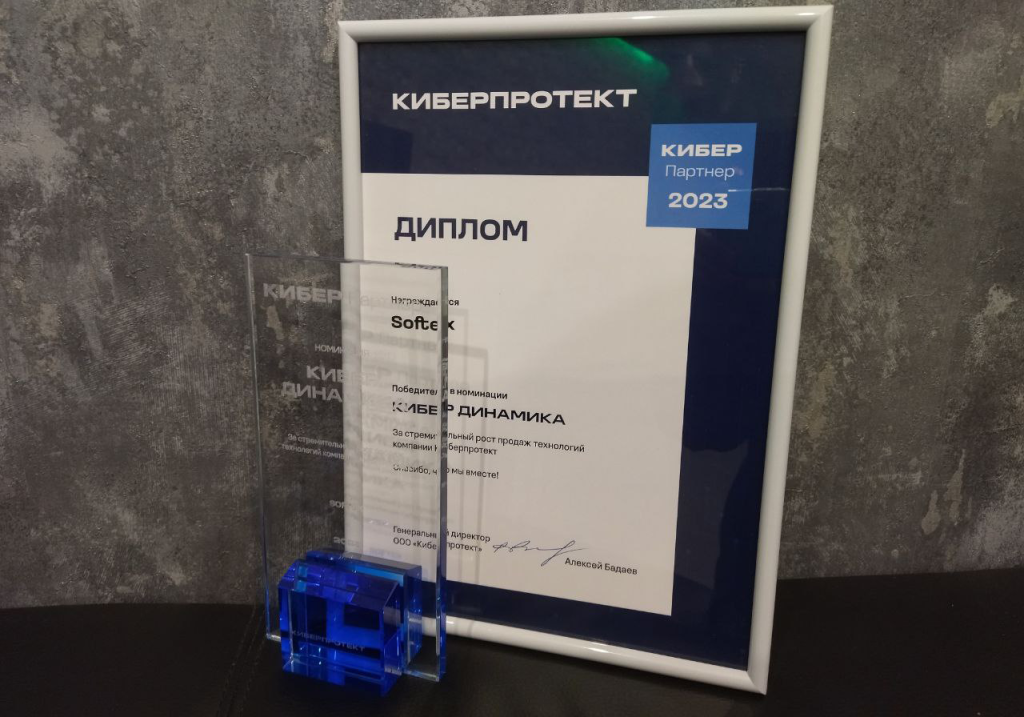 Благодарим вендора за все совместные проекты и за высокую оценку нашей работы – по итогам года мы были объявлены победителями в номинации «Кибер динамика» за стремительный рост продаж технологий «Киберпротект».