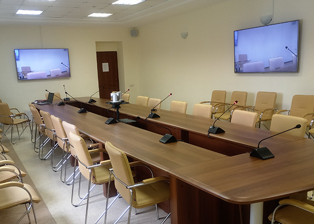 – Коммерческие телевизоры LG – Конференц-система Shure – Видеоконференцсистема TrueConf – Коммутационное оборудование – Устройства обработки звука – Беспроводные микрофоны – Роботизированные камеры А также кабели питания, провода, сетевые фильтры, кронштейны и крепления. Система озвучивания была построена на оборудовании Ecler.